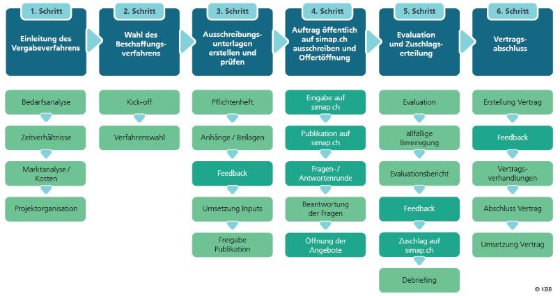 Ablauf des Beschaffungsprozesses aus «Das öffentliche Beschaffungswesen auf einen Blick» von Aus- und Weiterbildung KBB Allgemeine Massnahmen